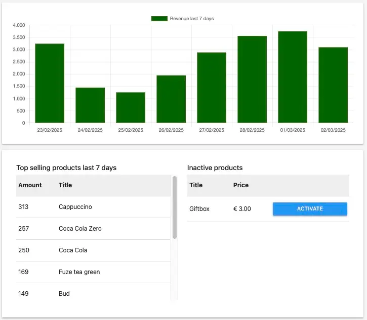 Einfache Verwaltung Ihrer Produkte, Einblick in den Umsatz und Ihre meistverkauften Produkte. Unsere Bestellsoftware sorgt für eine Steigerung Ihres Umsatzes durch intelligente Menüvorschläge.